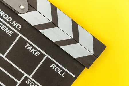 Filmmaker profession. Classic director empty film making clapperboard or movie slate isolated on yellow background. Video production film cinema industry concept. Flat lay top view copy space mock up
