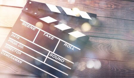 movie clapper on wood table ; film, cinema and video photography concept