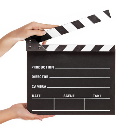 Movie production clapperboard hold by female hands.