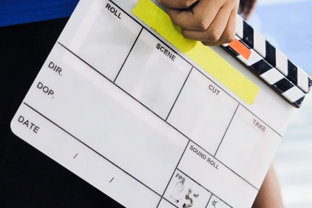 Film Slate, close up image of film production crew holding Film Slate on set