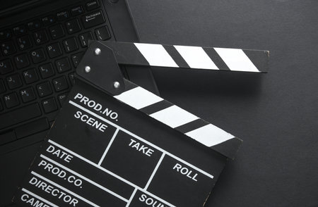 Movie clapperboard with laptop on black background