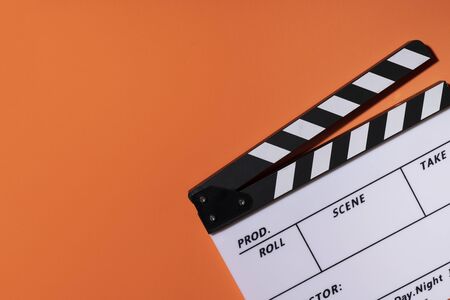 movie clapper on orange table background ; film, cinema and video photography concept