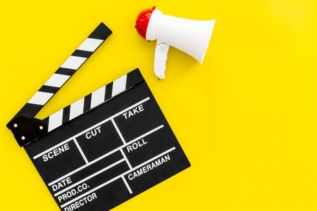Film director, producer concept. Electronic megaphone and clapperboard on yellow background top view.