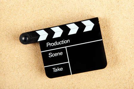 Movie clapper board on beige brown background. Filmmaking, Movie production, Entertainment industry. top view