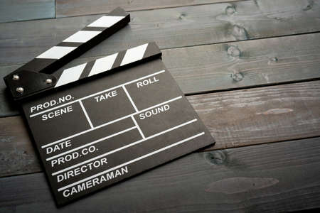 movie clapper cinema board or Slate film.Clapperboard for filmmaking and video production to assist in synchronizing of picture ,sound on Wooden Floor Tiles background.cinema concept