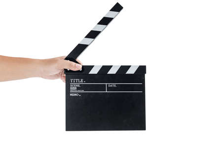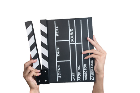 Opened clapperboard for cinema in hand, before filming on a black isolated background with red and blue backlighting