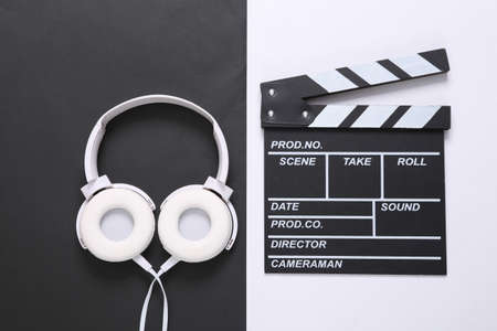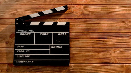 Filmmaking concept. Movie Clapperboard. Cinema begins with movie clappers. Top view. Copy space. Place for your text.