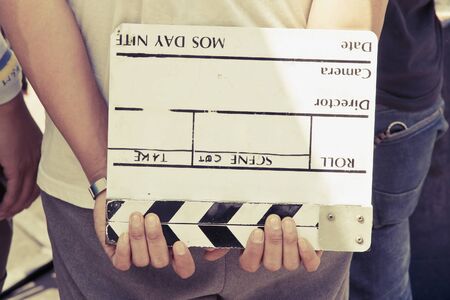 Blurry images of movie slate or clapper board. Hand holds empty film making clapperboard on color background in studio for film movie shooting or recording.