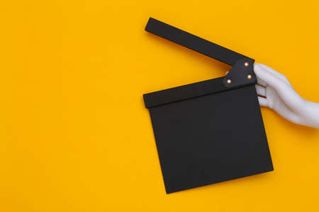 Elevate video production with a hand holding a clapper board on yellow. Ai Generated.