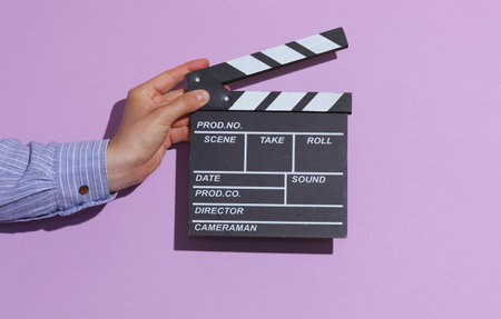 Man's hand in shirt holding clapperboard on purple pastel background with shadow.