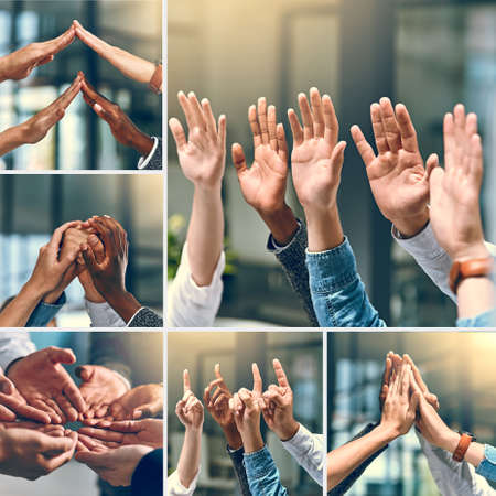 Raise your hand if youre in the best team ever. Composite shot of a group of unrecognizable people putting up their hands and using different types of gestures inside of a office.