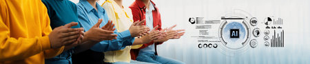 A diverse group of individuals engages in a moment of applause, showcasing enthusiasm for technology and data while surrounded by digital interface elements.