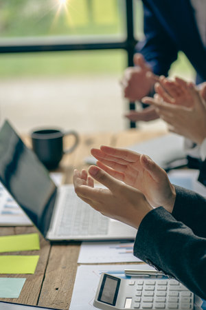 Group business people applauding at startup company meeting, business meetings, startup company sales team meetings, brainstorming and summary company performance. Business strategy management concept
