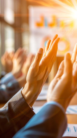 Business people hands clapping, showing applause and appreciation for success and achievement during a corporate event or conference meeting in bright office with sun flair