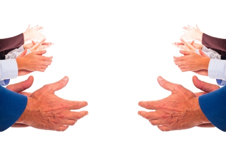 This image depicts a group of people clapping their hands together in unison. The focus is on the hands of the individuals, capturing the moment of applause. The background is blurred, emphasizing the action of clapping. The setting appears to be indoors, possibly at an event or a meeting.