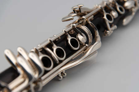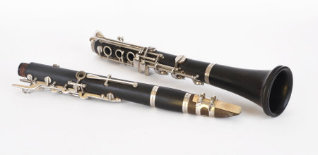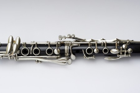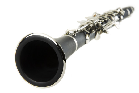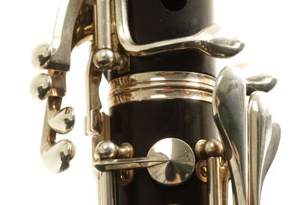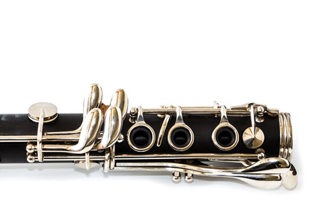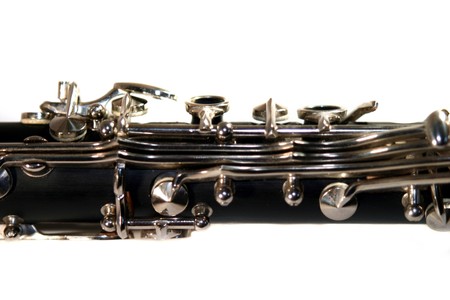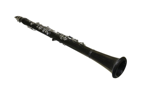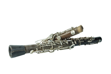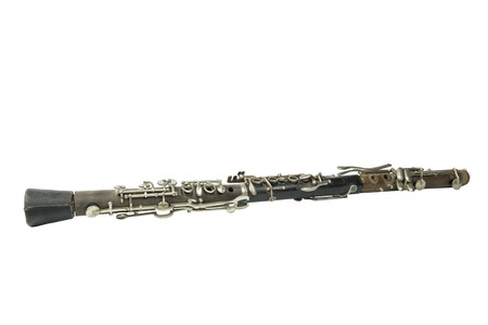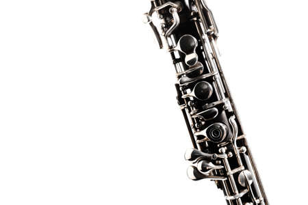 old clarinet body, with the silver mechanisms on the black wood. white background and free space for text