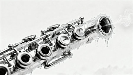 Silver flute covered in frost and delicate icicles with cold mist and high contrast monochrome tones emphasizing metal texture and frozen details. The composition includes ample clean empty space suitable for text or design placements