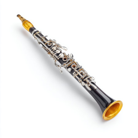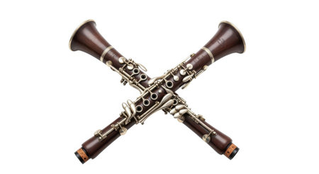A detailed image showcasing two wooden clarinets artfully crossed against a clean white background. This visual highlights the intricate design and classic form of these musical instruments, perfect for educational or artistic purposes.