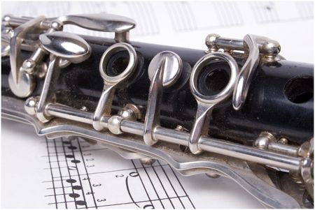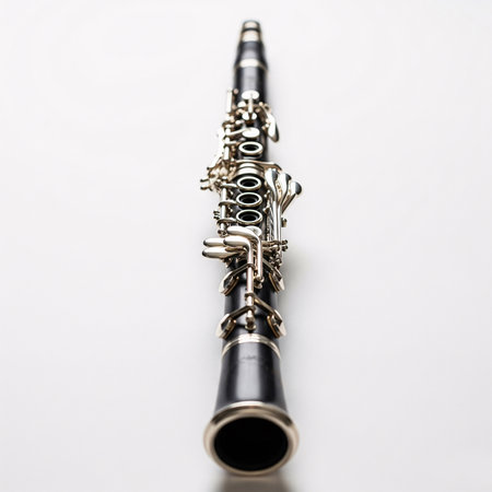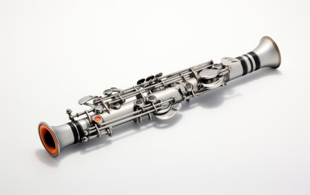 This close-up image highlights a beautifully crafted silver clarinet, focusing on the intricate details of keys and mechanisms, perfect for showcasing music artistry.