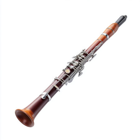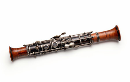 This image features a beautifully crafted wooden oboe, highlighting its intricate key design and glossy finish, perfect for music enthusiasts and professionals.