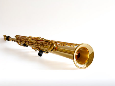 Soprano Sax, wind instrument saxophone lying on a white background, copy space.