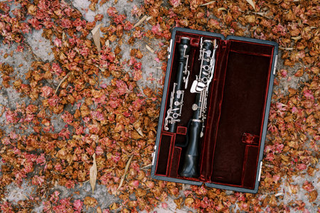 Open clarinet case lies on a stone floor strewn with dried red flower buds