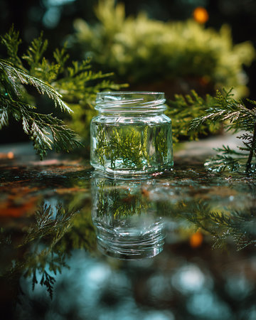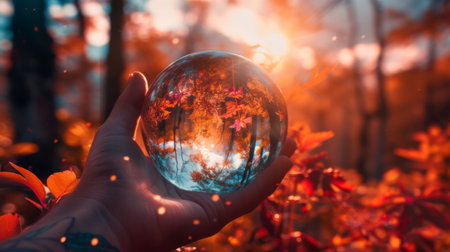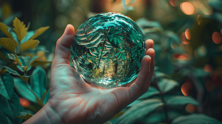 A hand holding a glass sphere that reflects vibrant forest leaves, symbolizing connection with nature and sustainability.