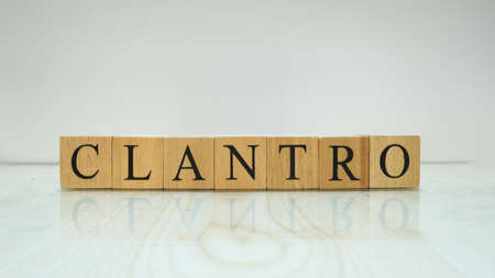 The word Coriander was created from wooden letter cubes. Gastronomy and spices. close up.