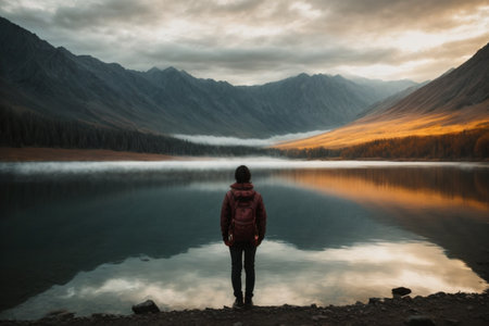 Hiker standing on the edge of a mountain lake and enjoying sunrise