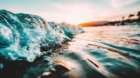 A low angle view of a turquoise sea wave breaking on a sandy beach. The setting sun in the background creates a warm, serene and tranquil atmosphere.