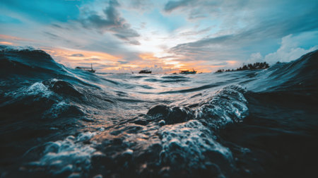 A powerful and immersive shot from inside the ocean, looking at the turbulent waves and a stunning, colorful sunset on the horizon under a dramatic cloudy sky.