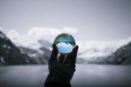 Color splash in Crystal ball held by a hand, with black and white background of Mountains and Glaciers.