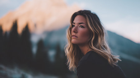 A young woman with blonde hair and freckles looks off into the distance with a mountain range in the background.