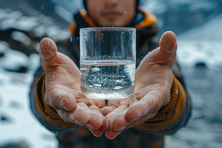 Transparent glass glass with drinking mountain water in hand on the background of a mountain river. The concept of drinking mineral water.