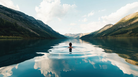 A swimmer glides through calm, clear water reflecting the sky and mountains. The serene landscape creates a peaceful atmosphere under a bright blue sky.