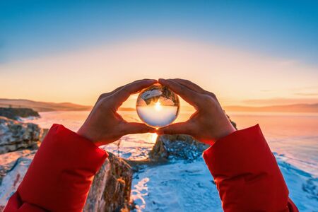 View of Shamanka rock through a glass ball at sunset with natural breaking ice in frozen water on Lake Baikal, Siberia, Russia.