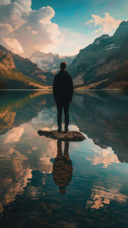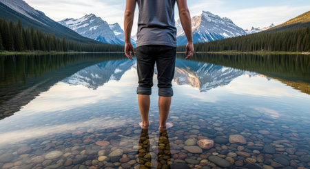 Young caucasian male standing in mountain lake reflecting scenic landscape
