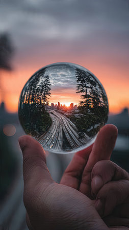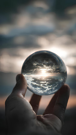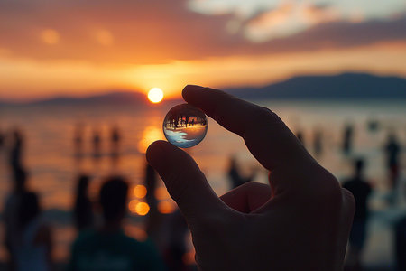 An artistic photograph that adds a fresh perspective to travel blogs, lifestyle articles, or creative visual projects | This image offers an immersive experience, where the warm hues of a sunset are encapsulated in a small glass sphere held between fingers. The inverted reflection within the sphere reveals a serene beach scene, with silhouettes of people gathered to witness the day's end. Skies painted with orange, pink, and blue gradients provide a dramatic backdrop to this tranquil moment. The defocused crowd in the background creates a sense of community and collective appreciation for nature's spectacle. The hand's gesture is gentle, giving the impression that the moment is as delicate as the glass bauble holding it. Precision and intricacy are evident in the way the sphere's surface reflects and intensifies the sunset's beauty, transforming a familiar sight into something magical | This striking visual can enhance travel and tourism marketing materials, or serve as a metaphor in discussions about perspective, reframing life experiences, or finding beauty in small things. The photo could also be utilized in educational content explaining optics or the science of light, resonating well with themes like reflection and refraction | A high-quality image of a sunset seen through a glass orb with soft-focus background that brings a dreamlike quality to the scene, allowing for ample overlay space, suitable for various artistic and editorial applications