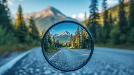 A close-up of a spherical road mirror showing a sharp curve in a mountain road with trees in the background