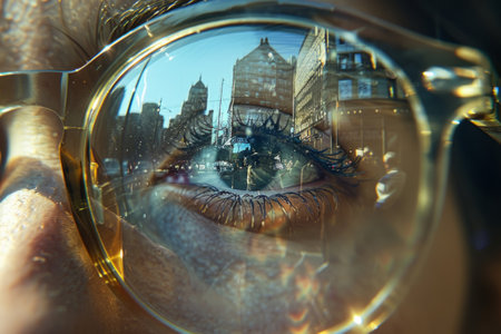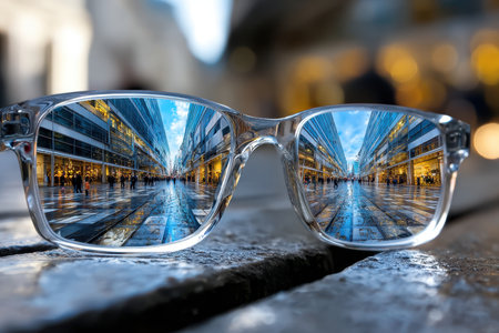 Clear sunglasses reflect a vibrant city street with shops and people enjoying the urban atmosphere.