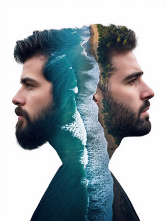 Double exposure of a man's face merging with the ocean and beach. Conceptual art portrait symbolizing nature and balance