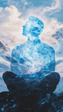 A man sits calmly, his silhouette glowing with radiant blues, blending seamlessly into the icy expanse of the tundra, embodying the cool serenity of glacial landscapes.