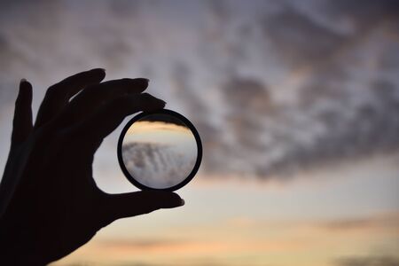 silhouette of female hand holding the lense and the blue sky on the background at the time of the sunset