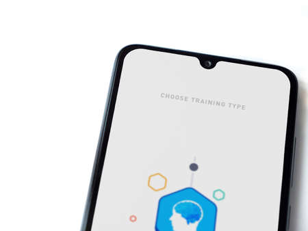 Lod, Israel - July 8, 2020: Elevate - Brain training games app launch screen with logo on the display of a black mobile smartphone isolated on white background. Top view flat lay with copy space.
