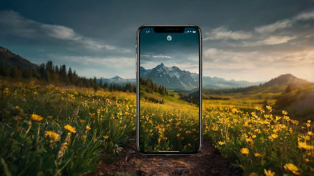 Alpine meadow with blooming yellow flowers and smartphone with photo screen
