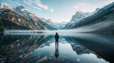 A person stands on a rock, surrounded by a majestic mountain landscape with still waters reflecting snow-capped peaks and forests.