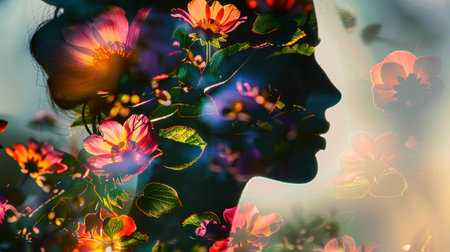 A double exposure portrait of a woman surrounded by colorful flowers, showcasing a blend of nature and human form against a light background