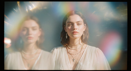 This artistic close-up portrait features a young woman with mesmerizing eyes and sparkling geometric reflections, creating a captivating and elegant visual experience.