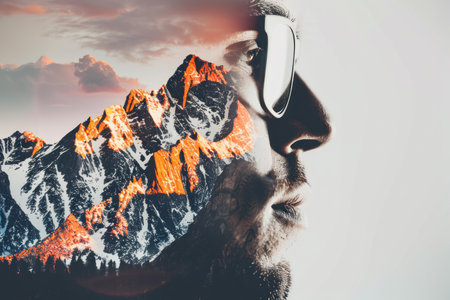 A captivating double exposure portrait featuring a man's profile merged with stunning natural landscapes. Ideal for themes of adventure and introspection.
