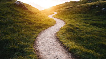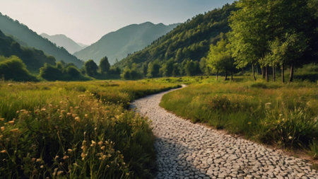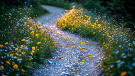 This illustration captures a peaceful mountain path lined with an array of colorful wildflowers in shades of purple, yellow, and pink. The scene is bathed in soft, warm light, enhancing the tranquil mood and inviting the viewer into a serene natural environment. Ideal for use in wellness and relaxation-themed projects. AI-generated illustration.